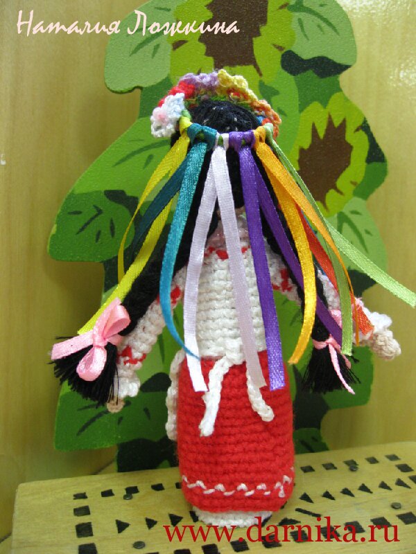 Куколку зовут Наталочка, она украинка. Её “рост” 12 см. Связана крючком 1,5 из остатков цветных клубочков.