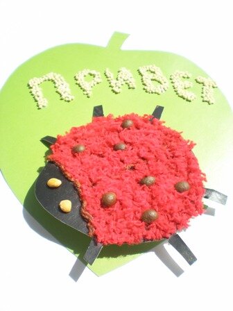 На картонный силуэт наклеиваем черные точечки из кофейных зерен, глаза – горох, а красная спинка – из ниток.