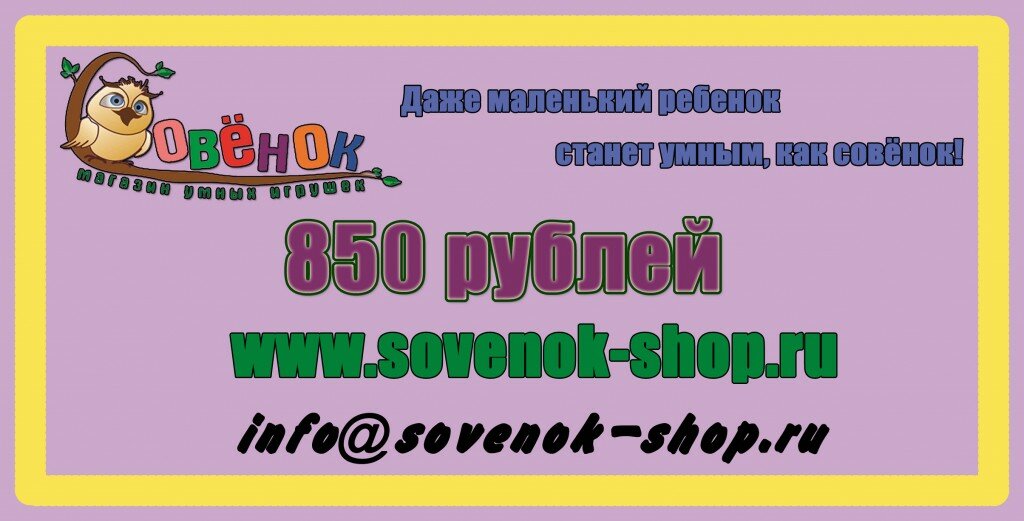2. Сертификат номиналом 850 рублей от магазина развивающих игрушек “Совенок”
